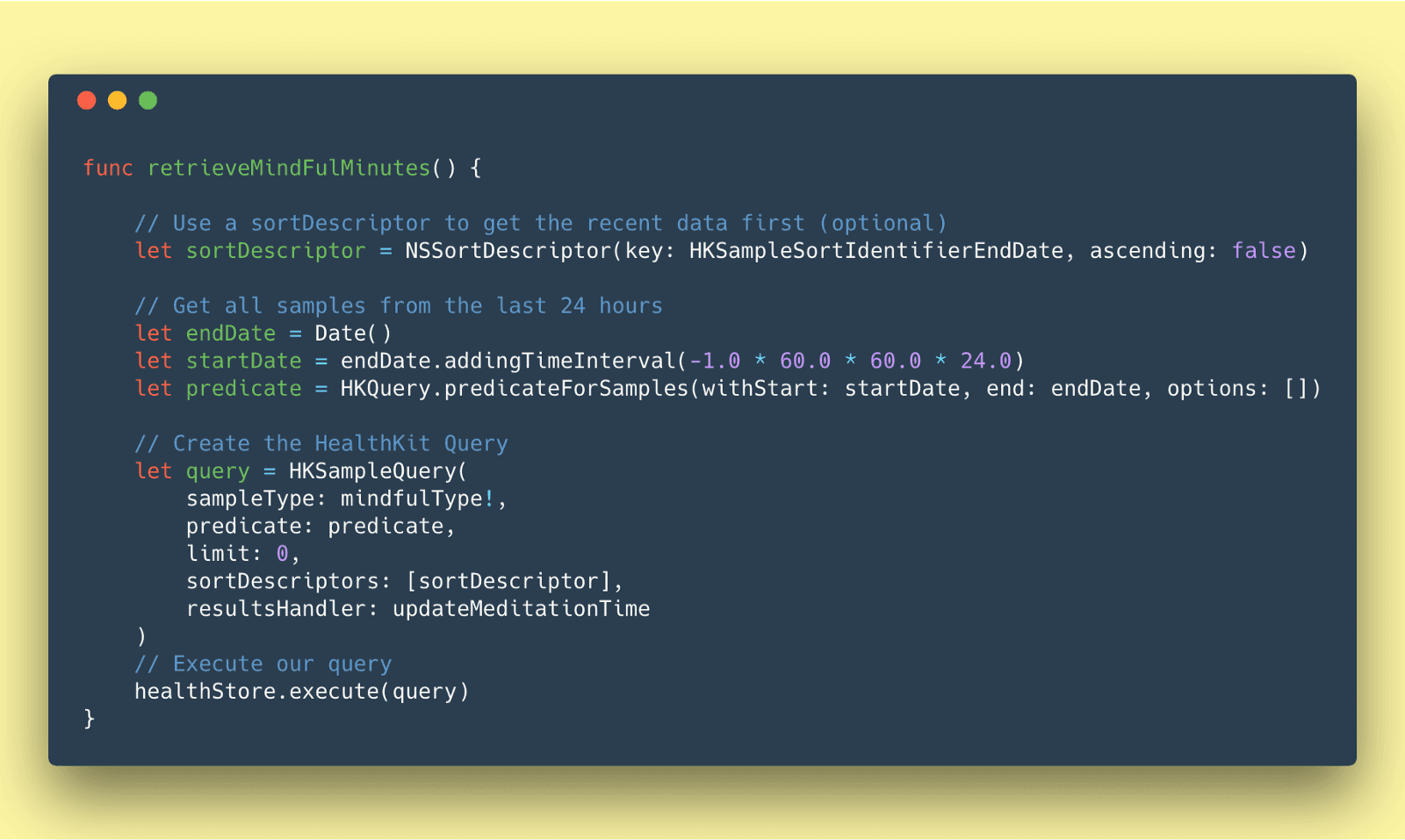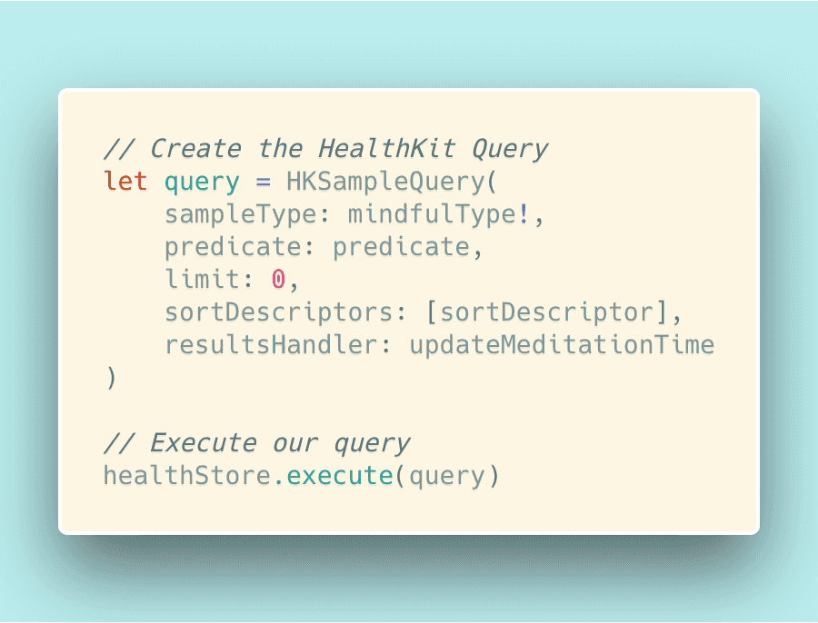 Finally, we want to combine the sortDescriptor, the predicate, and the sampleType we want from the HealthKit together with the function that will handle whatever is returned by the query (resultsHandler). After this is all composed into a HKSampleQuery, the only step left is to execute it!